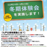 七戸公営柏葉塾は今年も 中学3年生を対象とした 【冬期体験会】を実施します! PDF版はコチラです お申し込みはお電話にて12月15日(月)からとなります。 この冬、七戸公営柏葉塾で受験勉強に取り組んでみませんか? 夏期 …