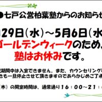 柏葉塾の4月カレンダーを掲載しています。 今年度から、授業時間が変更になります。 4月29日(火)から5月6日(火)まではゴールデンウィークのため、塾はお休みです。