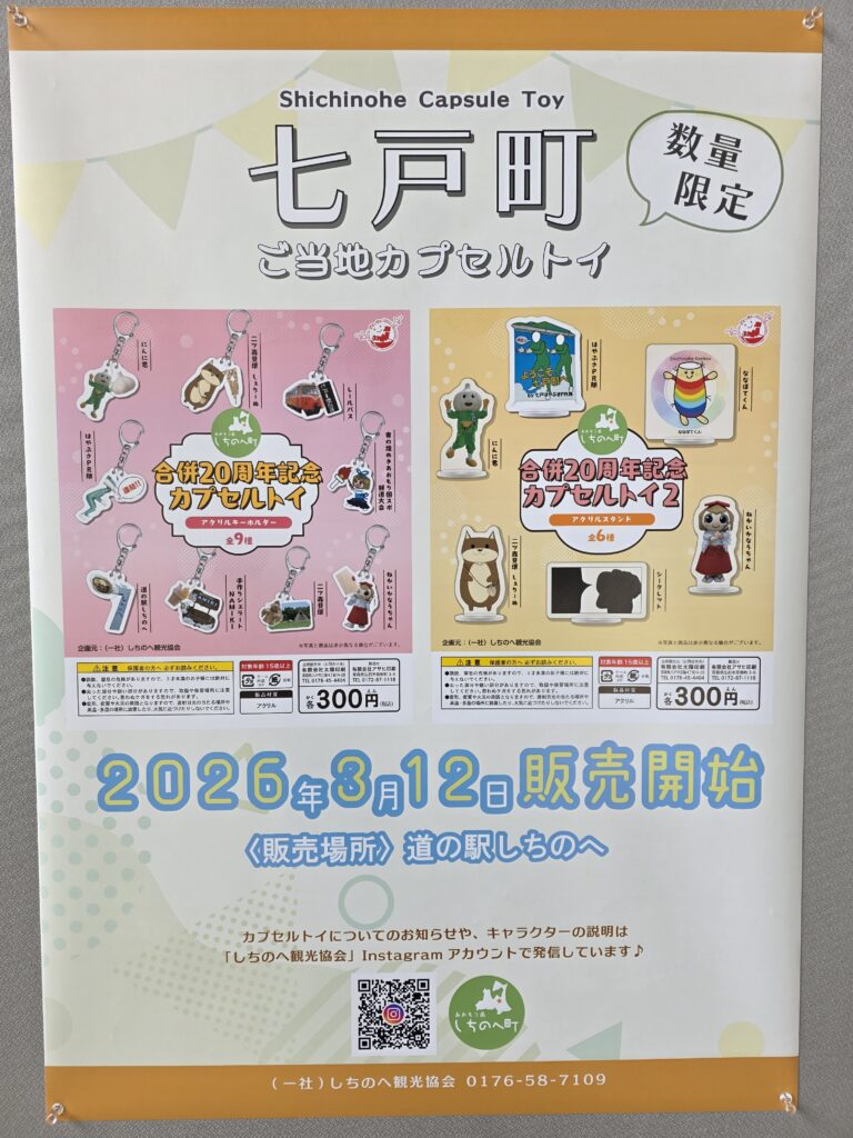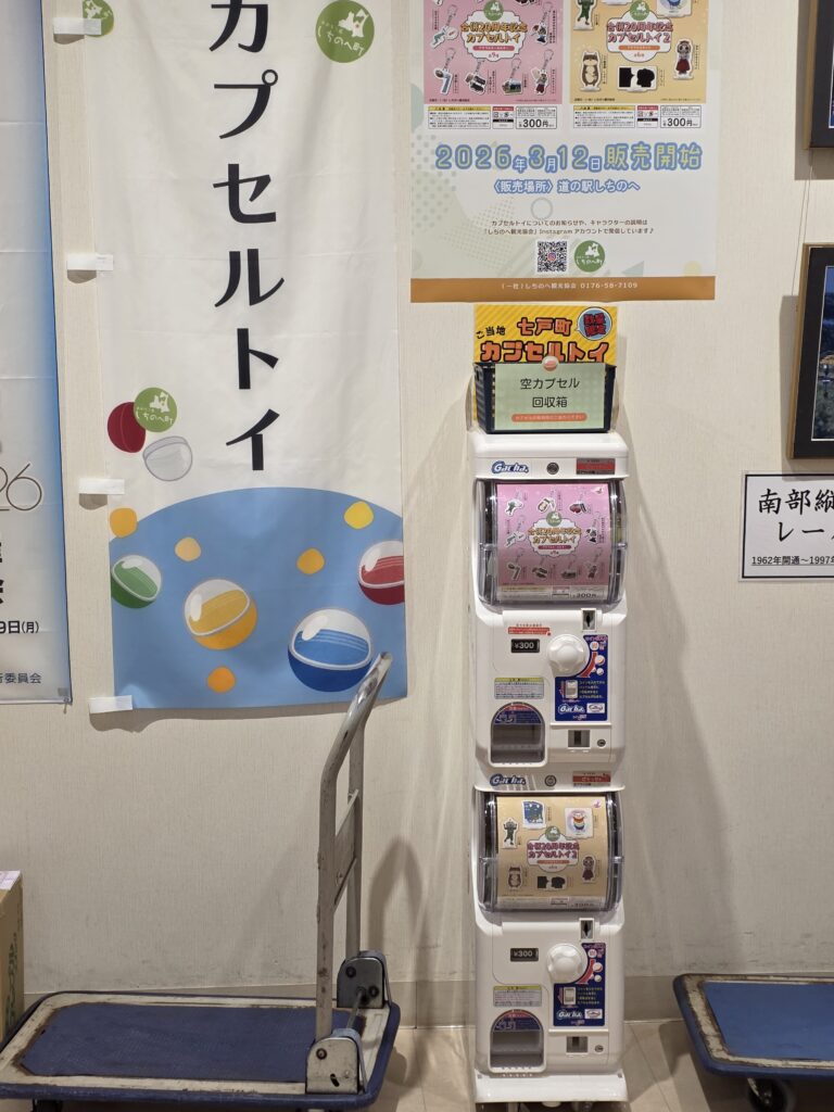 道の駅しちのへで、七戸町合併20周年を記念したカプセルトイを販売していたので、