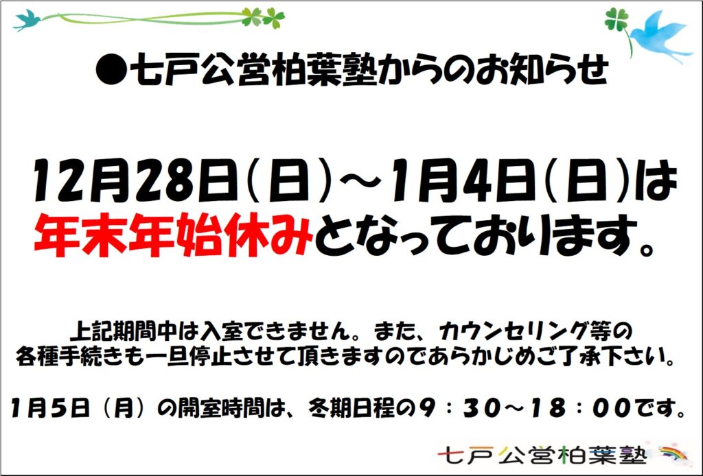 12月28日(日)から1月4日(日)までは、年末年始のため塾はお休みとなっております。