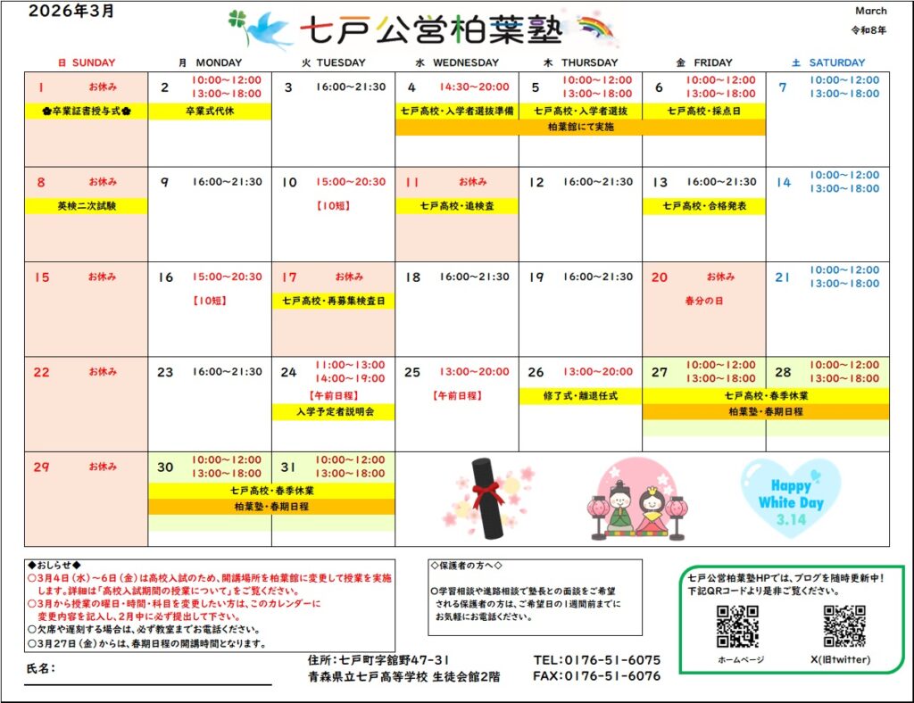 柏葉塾の3月カレンダーを掲載しています。