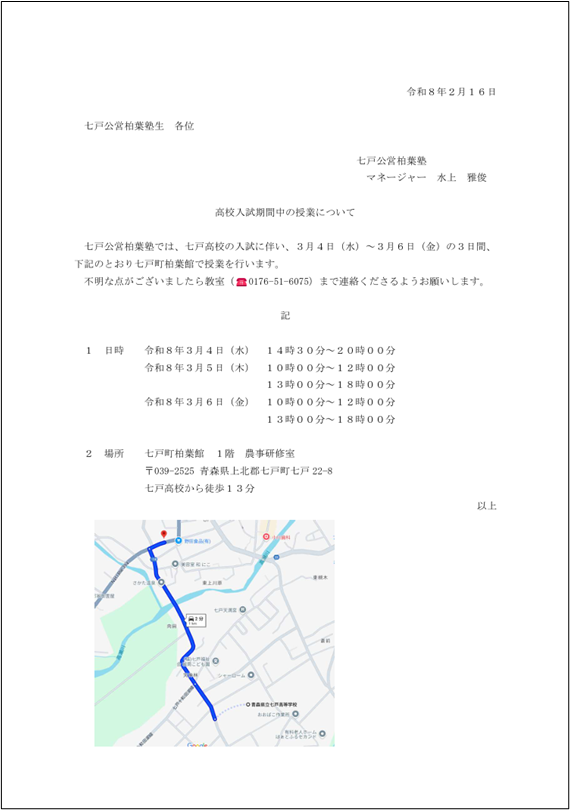 3月4日(水)~6日(金)は高校入試のため、開講場所を柏葉館に変更して授業を実施します。詳細は「高校入試期間中の授業について」をご覧ください。