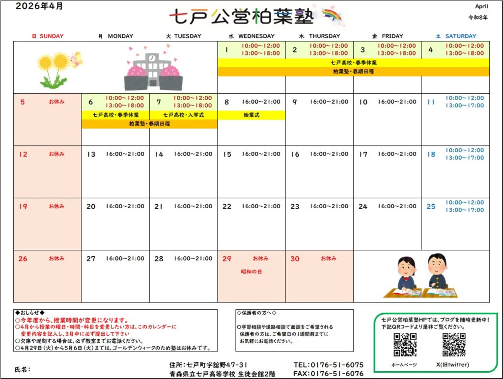 柏葉塾の4月カレンダーを掲載しています。